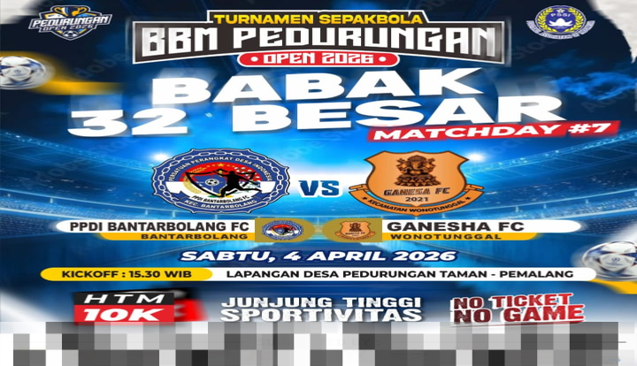 Hari ini, Sabtu (4/4/2026), turnamen sepakbola BBM Pedurungan Open 2026 memasuki fase yang sangat menentukan. Dalam pertandingan yang dinanti-nanti, PPDI Bantarbolang FC akan berhadapan dengan Ganesha FC Wonotunggal. Pertarungan ini akan berlangsung di Lapangan Desa Pedurungan, Kecamatan Taman, Pemalang, dan menjadi bagian dari Matchday #7 di Babak 32 Besar. Dengan semangat dan strategi yang akan dipertaruhkan, kedua tim bertujuan untuk meraih satu tiket berharga menuju babak selanjutnya.